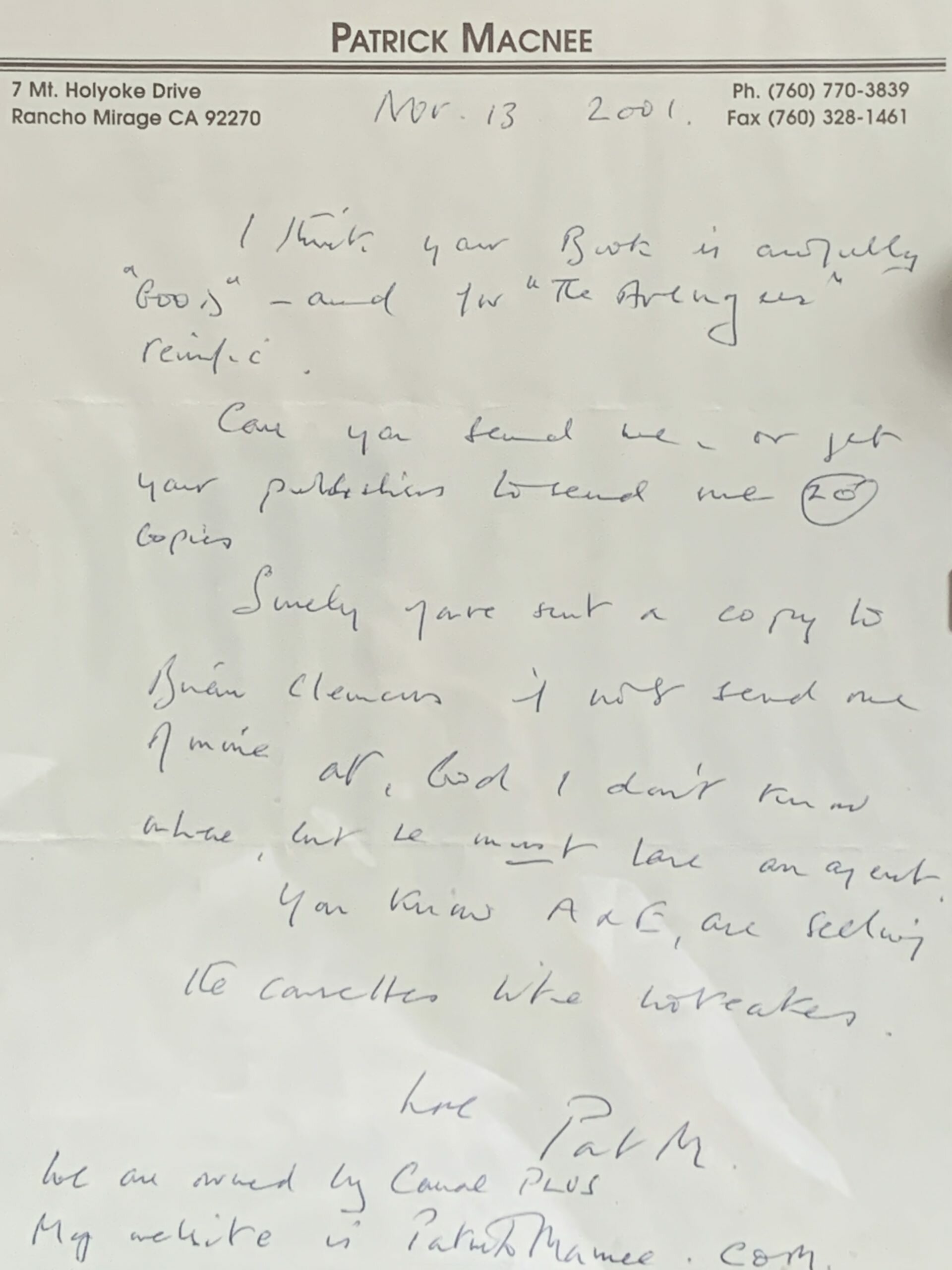 Patrick Macnee, John Steed on the Avengers, wrote a note to Tom after being interviewed by him for a book: “I think your book is awfully good, and for The Avengers, terrific.” After asking for 20 copies and suggesting that Tom send one to Avengers producer Brian Clemens, he concludes, “Love, Pat M.”