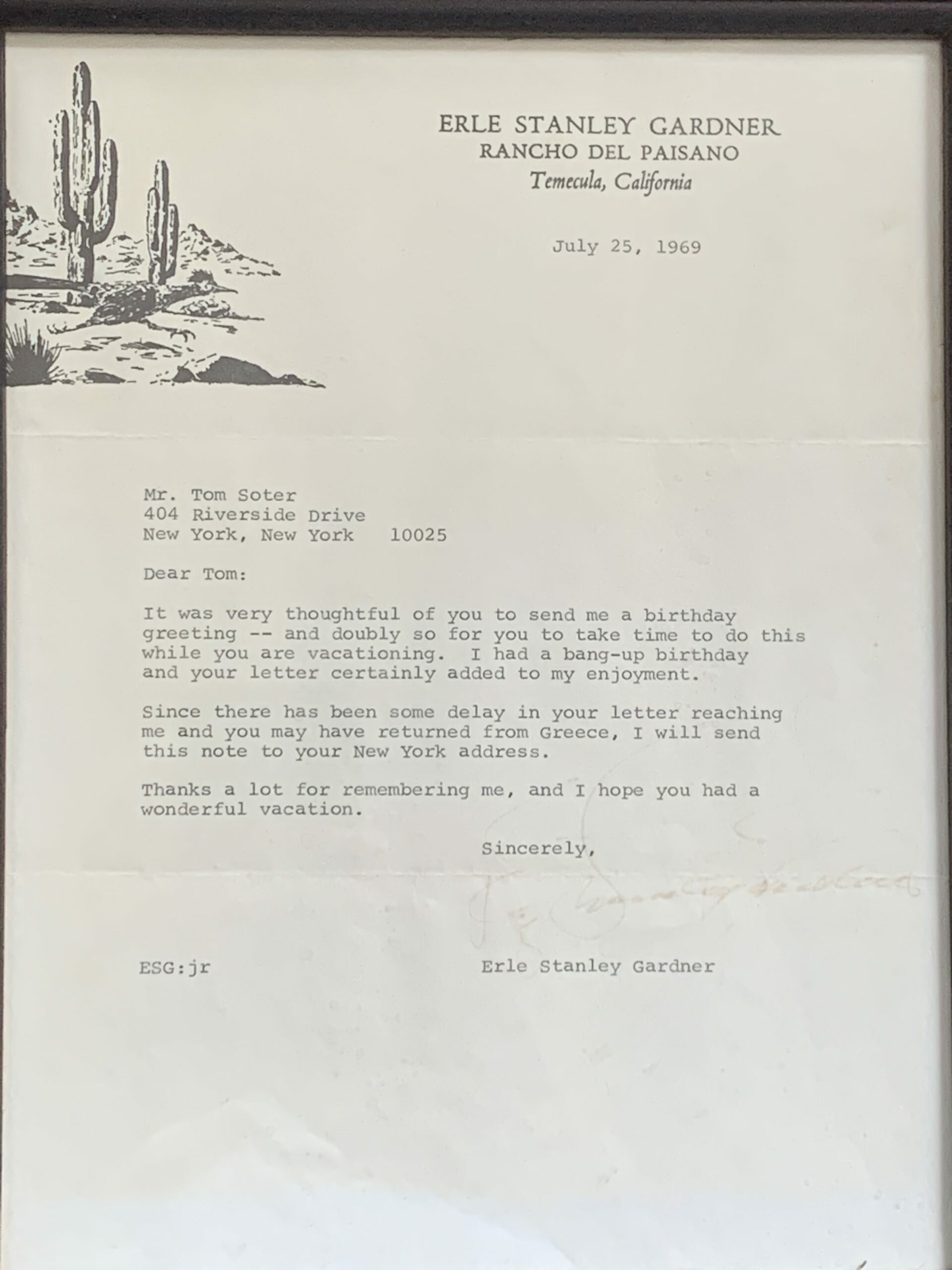 In the summer of 1969, a 12-year old Tom Soter discovered the address of Erle Stanley Gardner, and wrote him a letter to congratulate him on his 80th Birthday, which was July 17 of that year. At the time, Gardner, who created Perry Mason, was the most popular and best selling author in America. Tom’s letter to Gardner does not survive, but the author took the time to pen a letter on July 25, writing back to Tom on stationery from his California estate, Rancho del Paisano, and here is what he wrote: