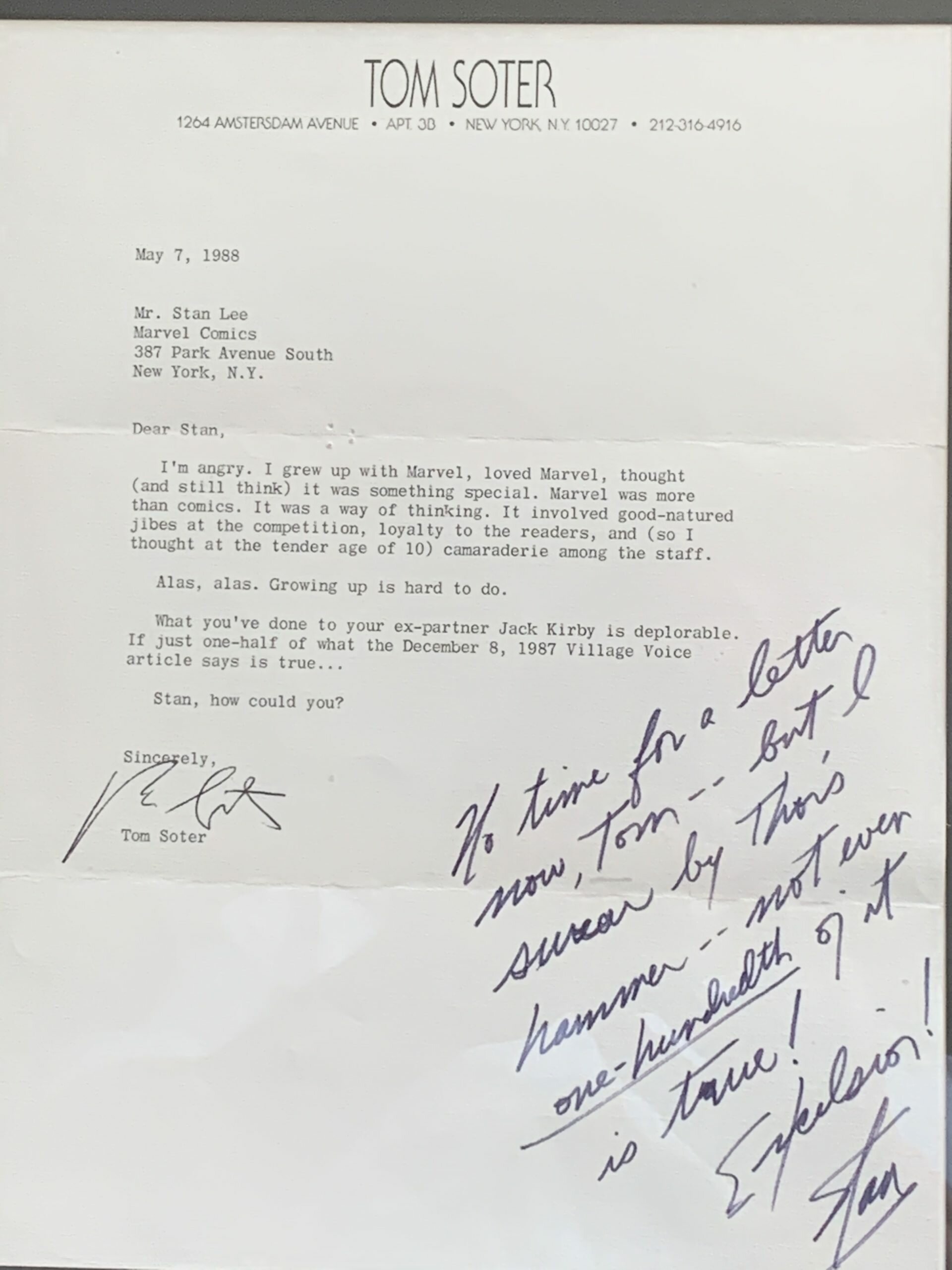 Tom wrote, “I’m angry. I grew up with Marvel, loved Marvel, thought (and still think) it was something special. Marvel was more than comics. It was a way of thinking. It involved good-natured jibes at the competition, loyalty to the readers, and (so I thought at the tender age of 10) camaraderie among the staff. Alas, alas. Growing up is hard to do. What you’ve done to your ex-partner Jack Kirby is deplorable. If just one-half of what the December 8, 1987 Village Voice article says is true….Stan, how could you?”